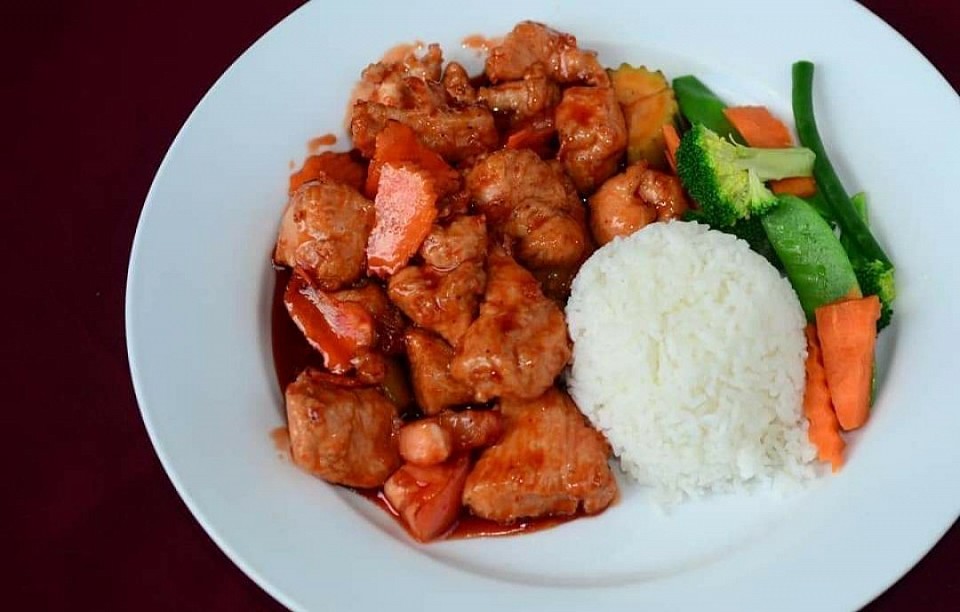 Boneless chicken in sweet and sour souce with seasonal fresh vegetables. (Only Shrimp add-4ci/ add shrimp-1ci each/ Dinner Portion add-4ci)