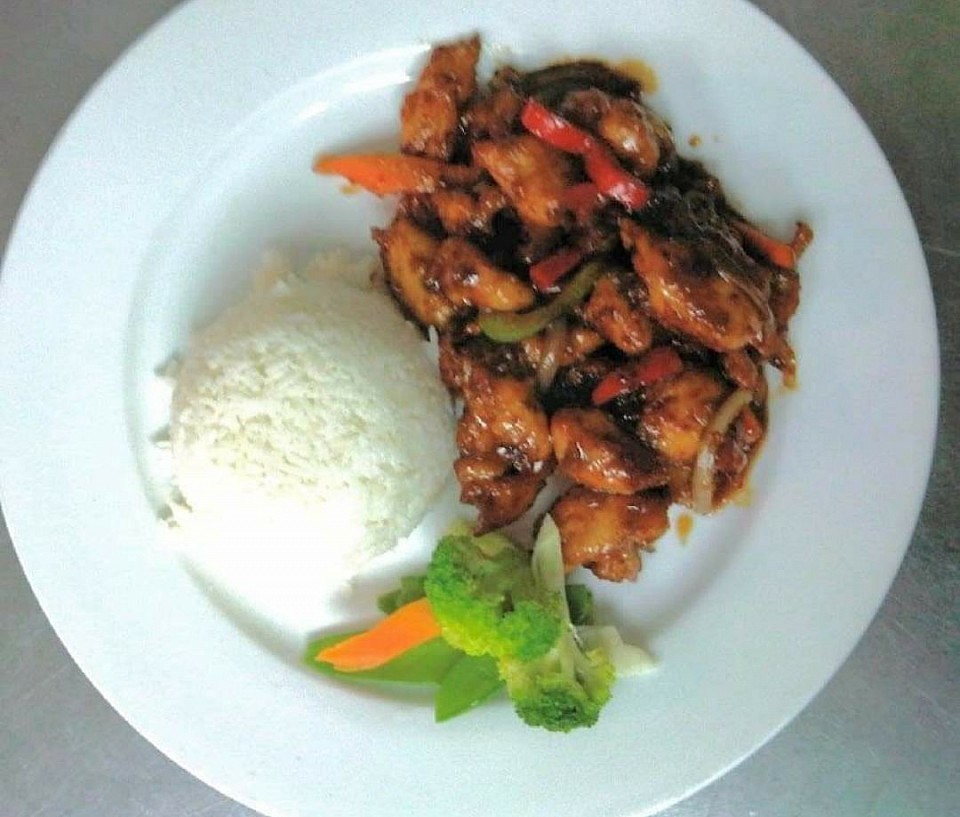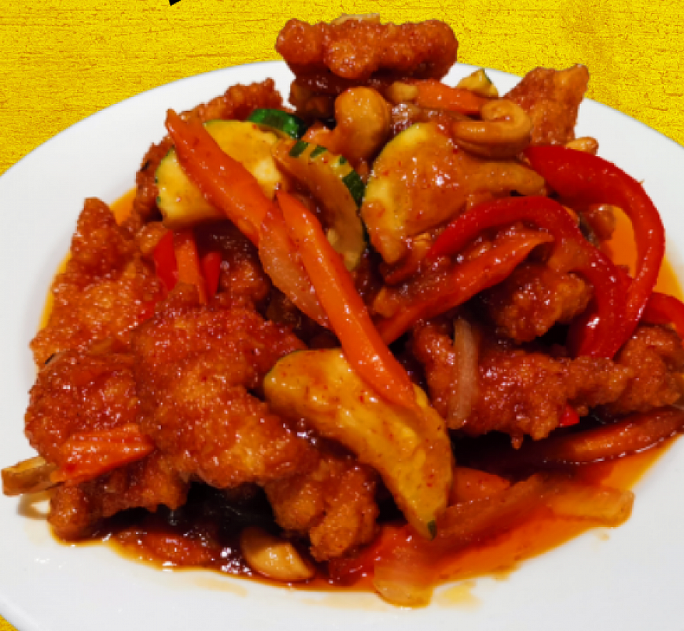 Crispy chicken sautèed in three flavored home-made sauce, sriracha sauce, onions, bell peppers and cucumbers.