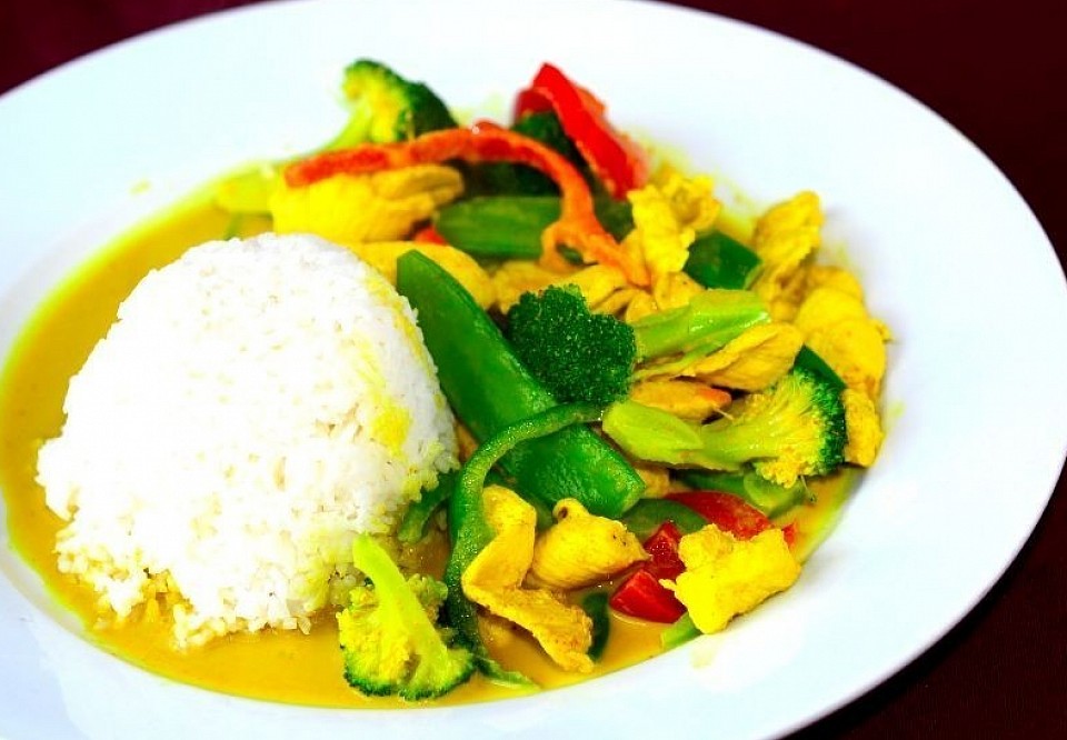 Broccoli, carrots, cabbages, bell peppers and onions with choice of green, red or yellow curry sauce. (Dinner Portion add-4ci)