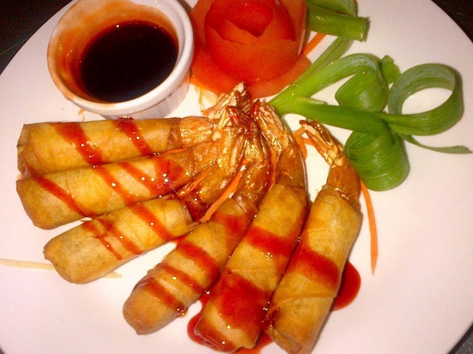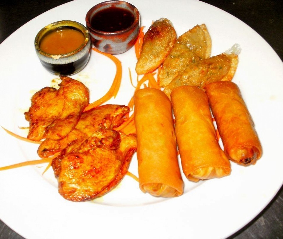 Egg rolls (3), chicken wonton (3) and Thai chicken satay (3) served with peanut suace and sweet and sour sauce.