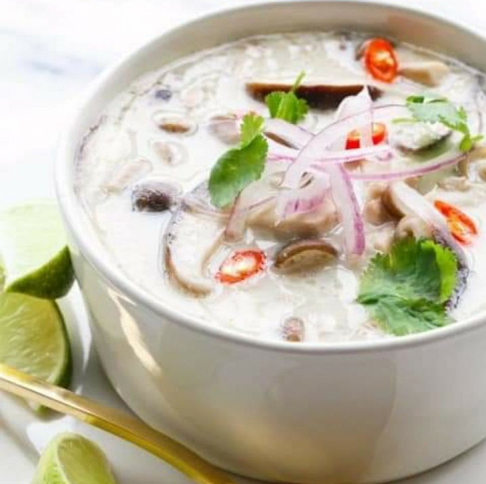Thai coconut milk soup with chicken, onions, galanga and lime leaves.