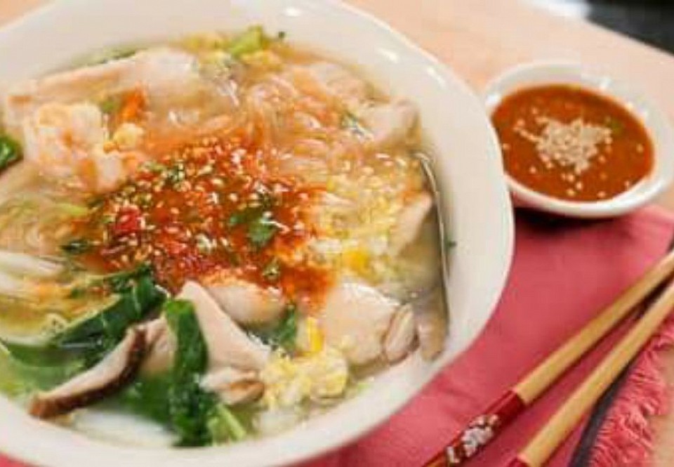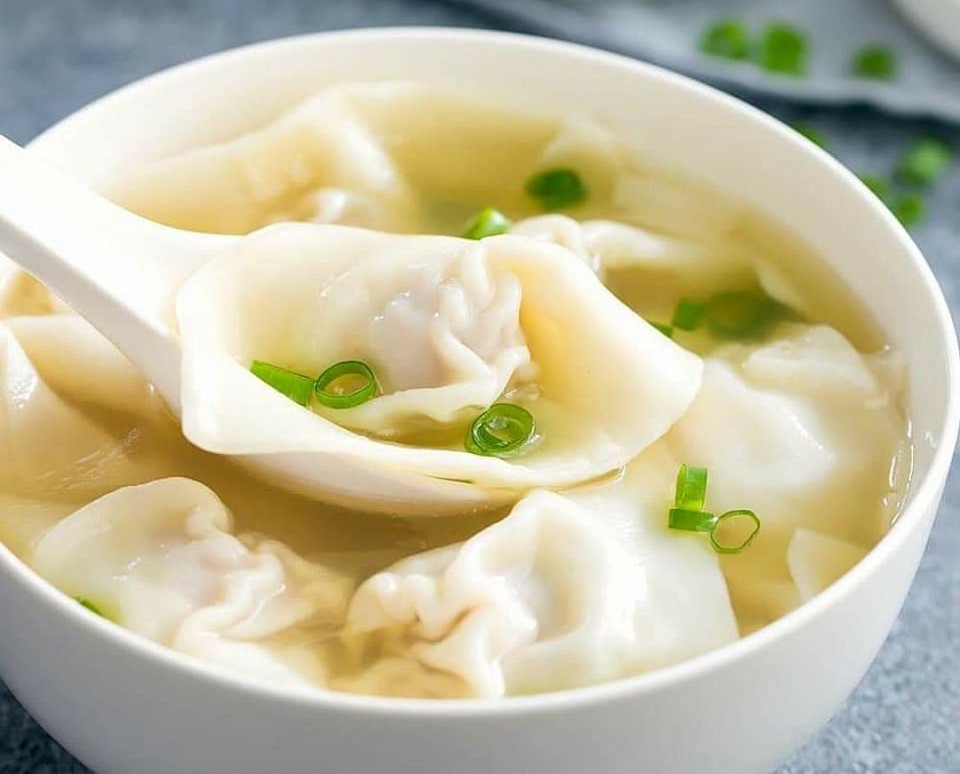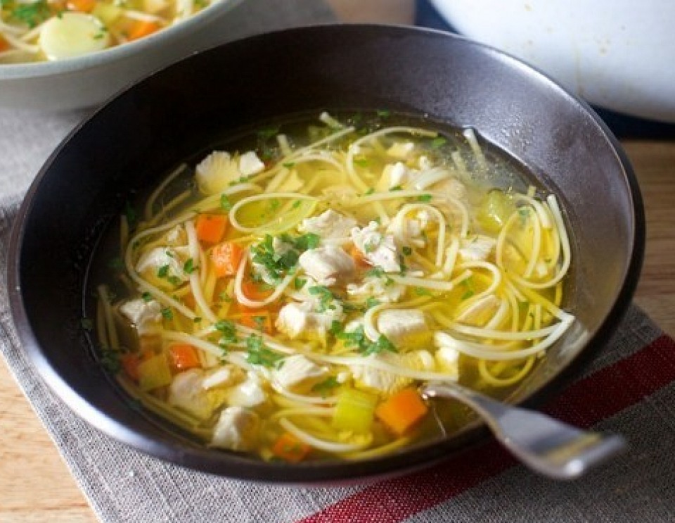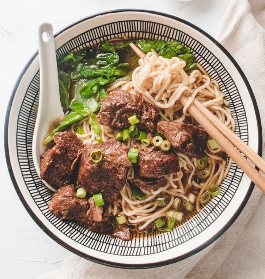 Clear broth with rice noodles or egg noodles with chicken, beef of tofu, broccoli, green onions, cilantro and cabbage.